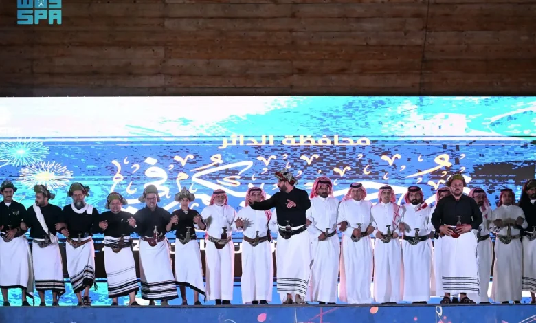 وقدّمت محافظة الدائر خلال مشاركتها عرضًا غنيًّا بالتنوع الثقافي والجمالي، حيث استعرضت الفرق التراثية ألوانها الشعبية المبهجة عبر رقصات وأهازيج جبلية متنوعة، من فن المزمّار الجبلي، وفنون “الرايح” و”الصفقة” و”المنصوبة” وطرق “العشي”، التي تميزت بإيقاعاتها الحيوية وأزيائها التقليدية الملونة، مضفية على الأمسية روحًا فنية أصيلة تأسر الأنظار.