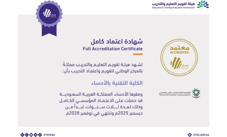 الكلية التقنية بالأحساء تحصل على الاعتماد المؤسسي الكامل