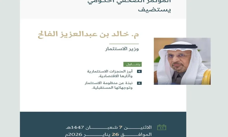 ينعقد يوم الاثنين 26 يناير 2026 المؤتمر الصحفي الحكومي الذي يستضيف معالي وزير الاستثمار المهندس خالد بن عبدالعزيز الفالح؛ للحديث عن أبرز المنجزات الاستثمارية وآثارها الاقتصادية، وتقديم نبذة عن منظومة الاستثمار وتوجهاتها المستقبلية، وسيجيب عن أسئلة الحضور والإعلاميين.