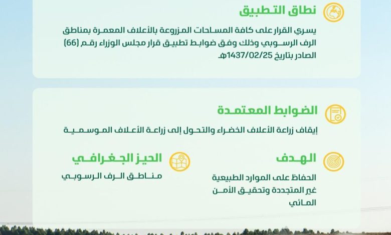 وأوضحت الوزارة أن القرار يسري على جميع المساحات المزروعة بالأعلاف المعمرة في مناطق الرف الرسوبي، وفق ضوابط تطبيق قرار مجلس الوزراء رقم (66) الصادر بتاريخ 25 / 02 / 1437هـ، مشيرة إلى أن المدة المتبقية لبدء التطبيق تبلغ 296 يومًا، في إطار الاستعداد التدريجي لتنفيذ القرار وفق الآليات المعتمدة.