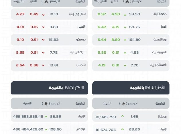 وكانت أسهم شركات محطة البناء، والرمز، وبوبا العربية، والعزيزية ريت، والاستثمار ريت، الأكثر ارتفاعًا، أما أسهم شركات سي جي إس، والأصيل، وجبسكو، وتبوك الزراعية، وشمس، فكانت الأكثر انخفاضًا في التعاملات، وتراوحت نسب الارتفاع والانخفاض ما بين (8.97%) و(4.27%)، بينما كانت أسهم شركات أمريكانا، والإنماء، وأرامكو السعودية، ودرب السعودية، والصناعات الكهربائية، هي الأكثر نشاطًا بالكمية، وأسهم شركات الإنماء، والراجحي، وأرامكو السعودية، والأهلي، ومعادن، هي الأكثر نشاطًا في القيمة.