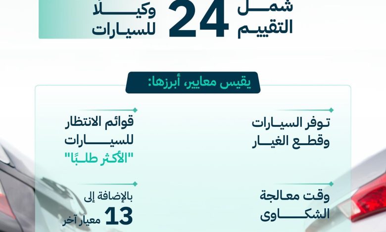 وشمل تقييم وكلاء السيارات (24 وكيلًا)، وتضمّن أربعة معايير رئيسة، منها بيانات المخزون والحجوزات، وخدمات ما بعد البيع، ومستوى الامتثال، والالتزام بحفظ حقوق المستهلك، وذلك عبر (16) مؤشرًا، من أبرزها وفرة السيارات الأكثر طلبًا، وقوائم الانتظار، ومدة الصيانة، وتوفر قطع الغيار.
