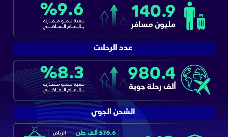 ولم تكن نسبة النمو البالغة 9.6٪ مجرد رقم عابر؛ بل هي نتيجة لتوسع في الطاقة الاستيعابية والربط الجوي؛ حيث سجَّلت مطارات المملكة حوالي 140.9 مليون مسافر، توزعوا بين 76 مليون مسافر دولي و65 مليون مسافر داخلي؛ وهذا النمو تزامن مع ارتفاع ملحوظ في عدد الرحلات الجوية بنسبة 8.3%؛ ليصل إجمالي الرحلات حوالي 980.4 ألف رحلة في إشارة واضحة لاستدامة انتعاش القطاع.