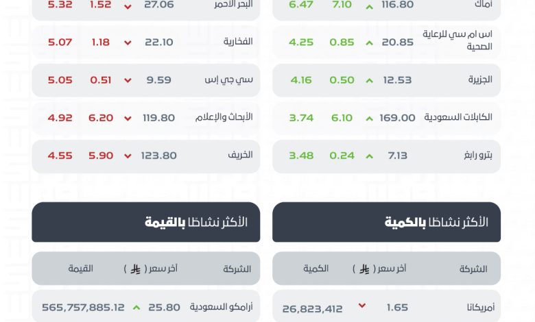 وكانت أسهم شركات أماك، وإس إم سي للرعاية الصحية، والجزيرة، والكابلات السعودية، وبترو رابغ، الأكثر ارتفاعًا، أما أسهم شركات البحر الأحمر، والفاخرية، وسي جي إس، والأبحاث والإعلام، والخريف، فكانت الأكثر انخفاضًا في التعاملات، وتراوحت نسب الارتفاع والانخفاض ما بين (6.47%) و(5.32%)، بينما كانت أسهم شركات أمريكانا، وأرامكو السعودية، والجزيرة، والإنماء، وبان، هي الأكثر نشاطًا بالكمية، وأسهم شركات أرامكو السعودية، ومعادن، والراجحي، والأهلي، والإنماء، هي الأكثر نشاطًا في القيمة.