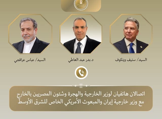 أجرى وزير الخارجية والهجرة المصري الدكتور بدر عبدالعاطي، اتصالات هاتفية، مع كل من نظيره الإيراني عباس عراقجي، والمبعوث الأمريكي الخاص للشرق الأوسط ستيف ويتكوف، ووزير الخارجية التركي هاكان فيدان، ووزير خارجية سلطنة عمان بدر بن حمد البوسعيدي، ورئيس مجلس الوزراء وزير الخارجية القطري الشيخ محمد بن عبدالرحمن بن جاسم آل ثاني.