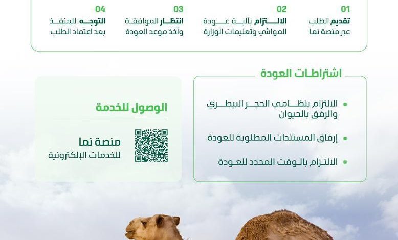 وأوضحت الوزارة أن الخدمة تمكن ملاك ورعاة الإبل ومواشي الرعي الذين لم يتسنى لهم العودة بكامل الأعداد الخاصة بهم من التقديم إلكترونيًا للحصول على إذن العودة، وفق اشتراطات محددة، تشمل تقديم الطلب عبر منصة “نما”، وفق آلية عودة مواشي الرعي إلى جانب تطبيق جميع الإجراءات المحجرية المعتمدة حسب نظام الحجر البيطري ونظام الرفق بالحيوان لدول مجلس التعاون الخليجي لدول الخليج العربية ولائحتيهما التنفيذيتين بالمملكة، وعدم التوجه إلى المنفذ إلا بعد صدور الموافقة على الطلب وأخذ موعد للعودة.