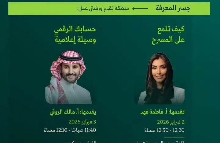 ويتضمن “جسر الإعلام” عددًا من المساحات التفاعلية، من أبرزها مساحة “جسر المعرفة” التي تقدم تجربة معرفية متكاملة تجمع المهتمين من مختلف التخصصات الإعلامية، من خلال ورش عمل قصيرة يشرف عليها نخبة من الخبراء والمتخصصين، حيث ستُقام ورشة عمل بعنوان “كيف تلمع على المسرح؟” تقدمها فاطمة فهد مذيعة أخبار على قناة العربية، كما سيقدم مدير عام قناة الثقافية مالك الروقي ورشة عمل بعنوان “حسابك الرقمي وسيلة إعلامية”، وسيحصل المشاركون في ختام الورش على شهادات حضور معتمدة من الأكاديمية السعودية للإعلام.