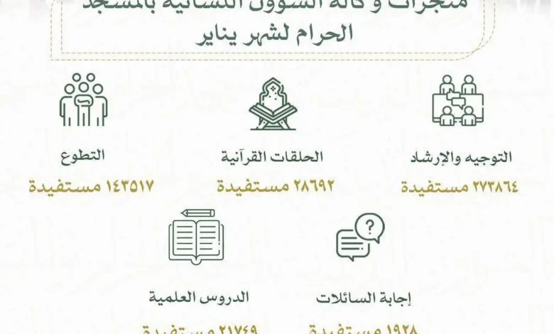وسجّلت الوكالة خلال شهر يناير 2026 منجزات نوعية، تمثّلت في استفادة (469,750) قاصدة من حزمة متنوعة من الخدمات، شملت برامج التوجيه والإرشاد الديني، والحلقات القرآنية، والدروس العلمية، والإجابة عن الاستفسارات الشرعية، إلى جانب مبادرات العمل التطوعي التي أسهمت في توسيع نطاق الخدمة والوصول إلى أكبر شريحة من الزائرات.