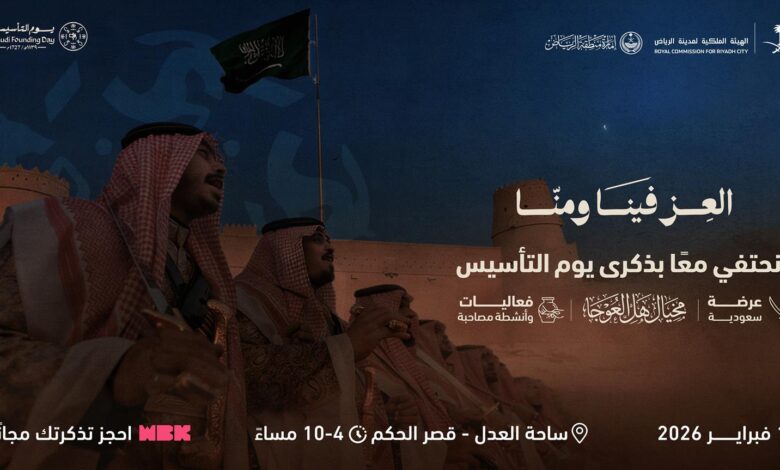 تحتفي الهيئة الملكية لمدينة الرياض، بالتعاون مع إمارة منطقة الرياض، بمناسبة يوم التأسيس، بتنظيم برنامج من الفعاليات الوطنية الثقافية والتراثية في ساحة العدل بمنطقة قصر الحكم، وذلك يوم السبت 14 فبراير 2026م؛ بهدف تعزيز الهوية الوطنية لدى مختلف فئات المجتمع، وربط الأجيال بتاريخ المملكة المجيد، وإبراز إرثها الثقافي العريق، وتسليط الضوء على القيم والمبادئ الراسخة التي قامت عليها الدولة السعودية منذ تأسيسها قبل ثلاثة قرون.