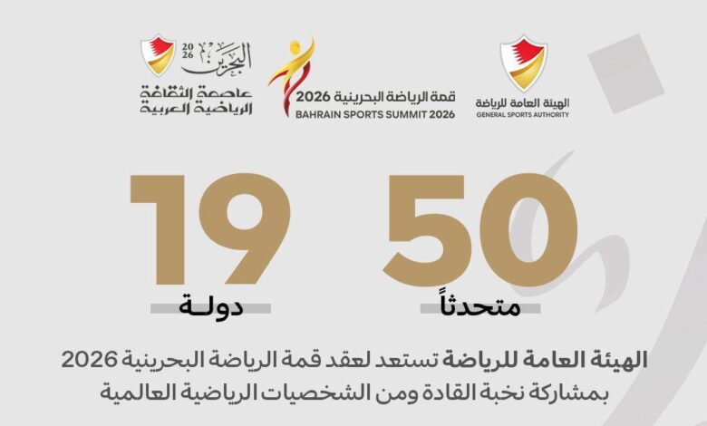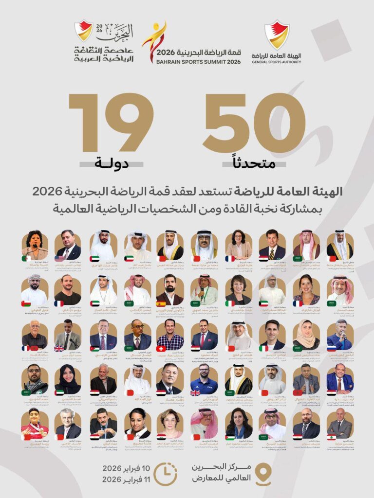 تنطلق فعاليات قمة الرياضة البحرينية يومي 10 و11 فبراير 2026، في مركز البحرين العالمي للمعارض، ضمن مبادرة البحرين عاصمة الثقافة الرياضية العربية، بمشاركة واسعة تضم 50 متحدثًا من 19 دولة، من القيادات الرياضية وصنّاع القرار والخبراء والمتخصصين في مختلف مجالات العمل الرياضي.