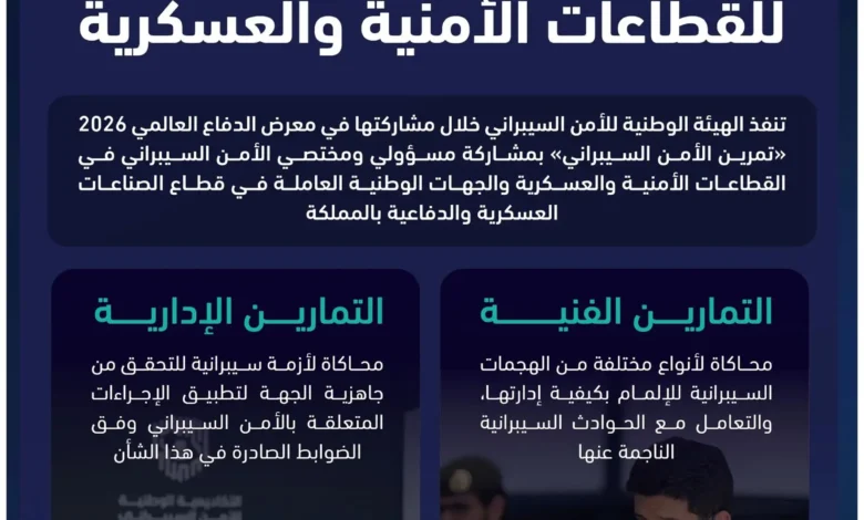 الهيئة الوطنية للأمن السيبراني تنفذ “تمرين الأمن السيبراني” للقطاعات الأمنية والعسكرية عبر جناحها بمعرض الدفاع العالمي 2026