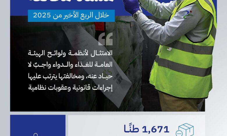 منعت الهيئة العامة للغذاء والدواء دخول نحو (1,671) طنًّا من المنتجات الغذائية الملوثة وغير المطابقة إلى المملكة، كما ضبطت (1,460) منشأة مخالفة خلال (11,547) جولة تفتيشية شملت (8,897) منشأة، وذلك في الربع الأخير من العام 2025.