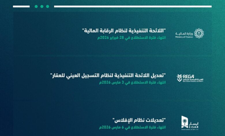 كما شهدت المنصة طرح مشروع (تعديل اللائحة التنفيذية لنظام التسجيل العيني للعقار)؛ الذي تهدف الهيئة العامة للعقار من خلاله إلى تنظيم وتحديث إجراءات التسجيل العيني، بما يضمن دقة بيانات الملكية، وحماية الحقوق، وتقليل النزاعات، ورفع كفاءة وموثوقية التعاملات العقارية، وينتهي الاستطلاع على المشروع بتاريخ 3 مارس 2026م.