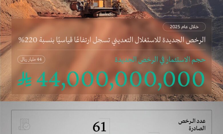 وأوضح المتحدث الرسمي للوزارة، جراح الجراح، أن عدد رخص استغلال التعدين والمنجم الصغير التي أصدرتها الوزارة خلال عام 2025م بلغ 61 رخصة، مقابل 19 رخصة في العام الذي سبقه, فيما تجاوز إجمالي حجم الاستثمارات في مشروعات الرخص الجديدة 44 مليار ريال لاستغلال خامات معدنية نوعية، تشمل الذهب والفوسفات, مشيرًا إلى أن إجمالي رخص الاستغلال التعديني السارية في المملكة بلغ 275 رخصة حتى نهاية عام 2025م، تغطي مساحة قدرها 2.16 ألف كم².