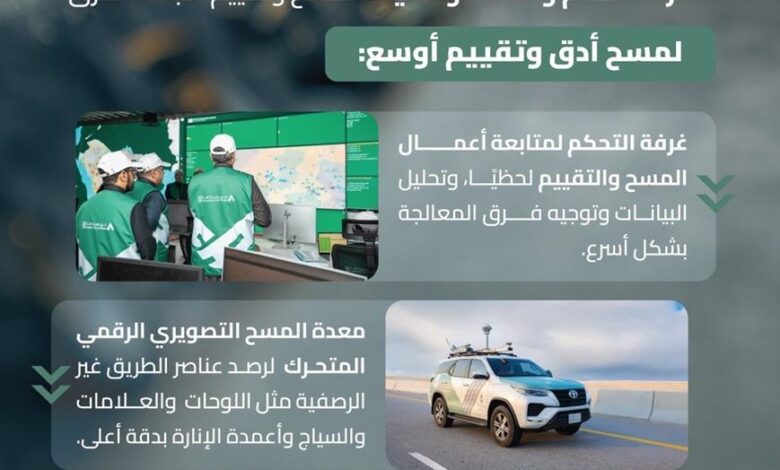 وفي إطار سعيها لتعزيز دقة الرصد، استخدمت الهيئة “معدة المسح التصويري الرقمي المتحرك”، المخصصة لرصد عناصر الطريق غير الرصفية بدقة عالية، والتي تشمل اللوحات الإرشادية، والعلامات الأرضية، والسياج، وأعمدة الإنارة؛ مما يسهم في الحفاظ على المظهر الحضري وسلامة مستخدمي الطرق.