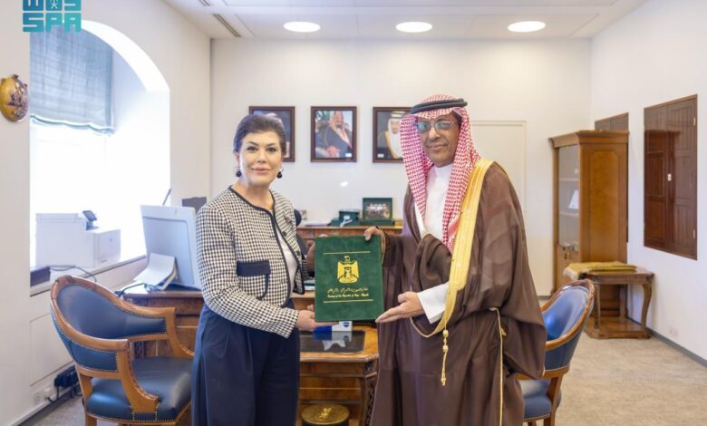 تسلم الرسالة وكيل الوزارة للشؤون الدولية المتعددة الدكتور عبدالرحمن الرسي، خلال استقباله بمقر الوزارة بالرياض اليوم، سفيرة جمهورية العراق لدى المملكة صفية طالب السهيل.