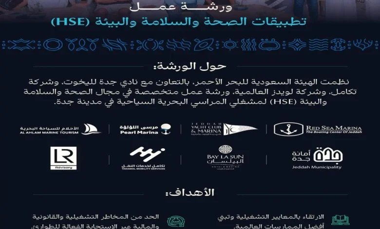 نظّمت الهيئة السعودية للبحر الأحمر، بالتعاون مع نادي جدة لليخوت والمارينا، وشركة تكامل، وشركة لويدز العالمية، ورشة عمل متخصصة في مجال الصحة والسلامة والبيئة (HSE) لمشغلي المراسي البحرية السياحية، وذلك ضمن جهودها المستمرة لتعزيز ثقافة السلامة والوقاية من المخاطر في الأنشطة السياحية الساحلية.