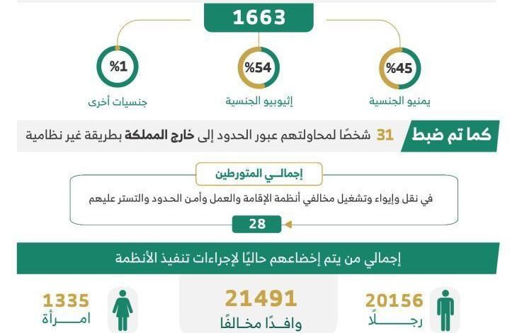 ثانيًا: بلغ إجمالي من تم ضبطهم خلال محاولتهم عبور الحدود إلى داخل المملكة (1663) شخصًا (45%) منهم يمنيو الجنسية، و(54%) إثيوبيو الجنسية، وجنسيات أخرى (01%)، كما تم ضبط (31) شخصًا لمحاولتهم عبور الحدود إلى خارج المملكة بطريقة غير نظامية.
