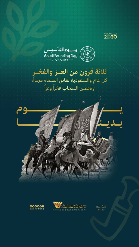 رفعت مجموعة سعيد غدران القابضة أسمى آيات التهاني والتبريكات إلى القيادة الرشيدة بمناسبة يوم التأسيس ، الذي يوافق 22 فبراير من كل عام، مستذكرةً العمق التاريخي للمملكة وإرثها الممتد لأكثر من ثلاثة قرون منذ عام 1727م.