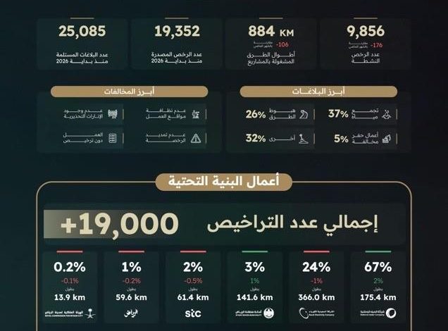 وكشف التقرير أن إجمالي الرخص المصدرة منذ بداية العام بلغ 19,352 رخصة، في حين وصل عدد الرخص النشطة إلى 9,856 رخصة؛ مما يعكس استمرار وتيرة العمل في مشاريع البنية التحتية وتوسع نطاق التنفيذ في مواقع متعددة داخل المنطقة.