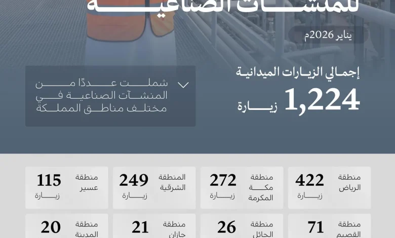وأوضح المتحدث الرسمي للوزارة جراح الجراح أن الزيارات الميدانية المنفذة خلال شهر يناير شملت 422 زيارة لمصانع في منطقة الرياض، و272 زيارة في منطقة مكة المكرمة، و249 زيارة في المنطقة الشرقية، إضافة إلى 115 زيارة في منطقة عسير، و71 زيارة في منطقة القصيم، و26 زيارة في منطقة حائل، و21 زيارة في منطقة جازان، و20 زيارة في منطقة المدينة المنورة، و14 زيارة في كل من منطقتي الجوف وتبوك.