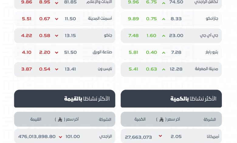 وكانت أسهم شركات تكافل الراجحي، وجازادكو، وجي آي جي، وبترو رابغ، ومدينة المعرفة، الأكثر ارتفاعًا، أما أسهم شركات الأبحاث والإعلام، وأسمنت المدينة، وجاكو، وصناعة الورق، ونايس ون الأكثر انخفاضًا في التعاملات، وتراوحت نسب الارتفاع والانخفاض ما بين (9.96%) و(9.86%)، فيما كانت أسهم شركات أمريكانا، وسبكيم العالمية، وأرامكو السعودية، وكيان السعودية، وبترو رابغ هي الأكثر نشاطًا بالكمية، بينما كانت أسهم شركات الراجحي، وأرامكو السعودية، والأهلي، وسبكيم، وإس تي سي، هي الأكثر نشاطًا في القيمة.
