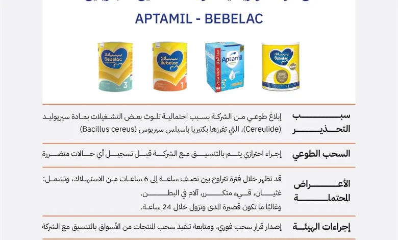 أصدرت الهيئة العامة للغذاء والدواء تحذيرًا بشأن عدد من منتجات حليب الأطفال التابعة لشركة “نوتريشيا دانون” للعلامتين التجاريتين (Bebelac و Aptamil)، وذلك إثر إبلاغ طوعي من الشركة وسحبها احترازيًا لبعض التشغيلات لاحتمالية تلوثها بمادة “سيريوليد” (Cereulide) التي تفرزها بكتيريا “باسيلس سيريوس” (Bacillus cereus)، التي قد تشكل خطرًا على صحة الرضع.