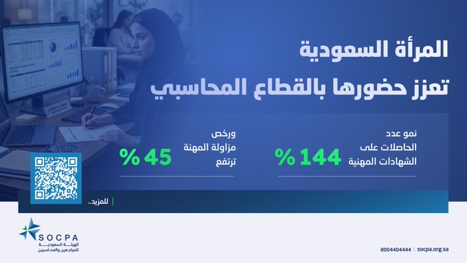 كشفت الهيئة السعودية للمراجعين والمحاسبين عن نمو متسارع لمشاركة المرأة في القطاع المحاسبي السعودي خلال الفترة من 2023م إلى 2025م في مؤشر يعكس تطور جودة البيئة المهنية واتساع قاعدة الكفاءات المؤهلة، ويعزز مسار صناعة الثقة في التقارير المالية عبر رفع مستوى الالتزام بالمعايير وتوسيع الممارسة النظامية للمهنة.