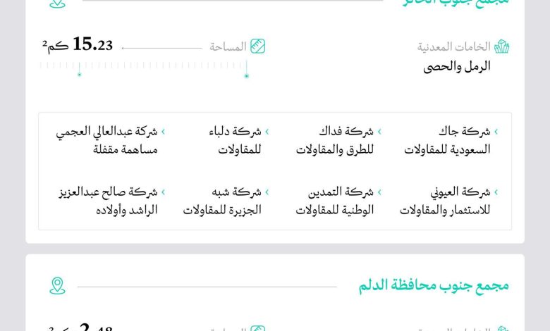 وأشار إلى أن عشر شركات فازت برخص محاجر مواد البناء في مجمع جنوب الدلم وهي: شركة دايم السمو التجارية، وشركة فهد علي القريني للتعدين، وشركة فيصل هباس القحطاني، وشركة رمل الوسام للتعدين، وشركة ماجد محمد العضيب للمقاولات، إضافة إلى شركة سعد هباس القحطاني، وشركة ردام للتعدين، وشركة كثبان الرمال الحمراء، وشركة رئام العربية للمقاولات، وشركة فيصل ملحم الدوسري.