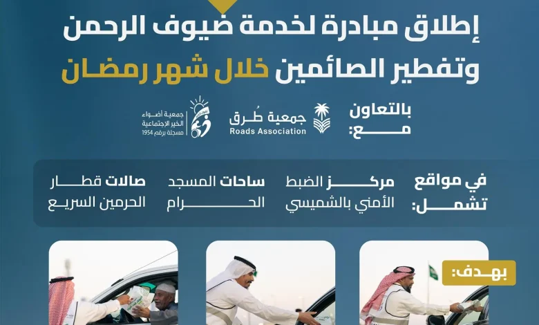 أعلنت الهيئة العامة للطرق، إطلاق مبادرة خيرية لخدمة ضيوف الرحمن وتفطير الصائمين خلال شهر رمضان المبارك، بالتعاون مع جمعية طرق وجمعية أضواء الخير، وذلك في إطار تعزيز الشراكة المجتمعية بين القطاع الحكومي والقطاع غير الربحي.