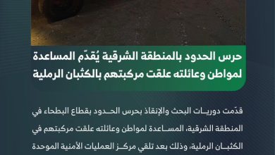 الدمام – واس : قدّمت دوريات البحث والإنقاذ بحرس الحدود بقطاع البطحاء في المنطقة الشرقية، المساعدة لمواطن وعائلته علقت مركبتهم…
